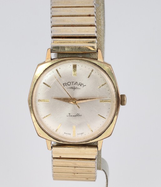 Lot 557 A gentleman's Rotary Incabloc wristwatch with silvered dial, contained in a gold plated case with gilt flexible bracelet £40-60