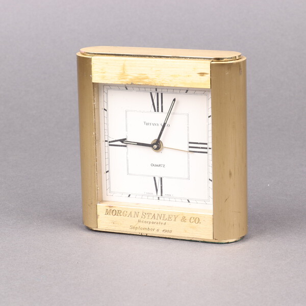 Lot 559 Tiffany & Co., a quartz alarm clock, the square white dial marked Tiffany & Co quartz, inscribed Morgan Stanley & Co Incorporated 6 September 1983, 11cm h x 9cm w x 3cm d £40-60