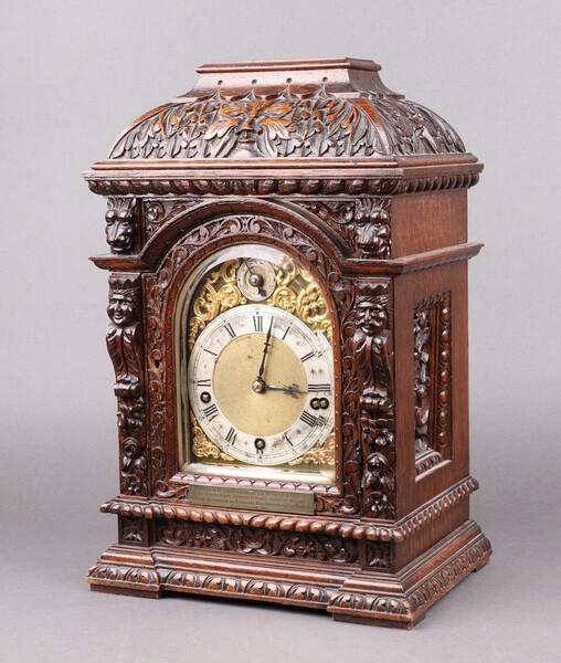 A Victorian Winterhalder & Hofmeire 8 day striking bracket clock with 16cm gilt dial, silvered chapter ring and Roman numerals, striking on 5 gongs, contained in a heavily carved oak case, with presentation plaque "Presented to Mr Frank Clocks by the officials and employees of The London Scottish Western Railway, Western District, upon his appointment as Permanent Ways Super Intendant at Wimbledon Exeter December 1900", complete with pendulum and key 43cm h x 28cm w x 20cm d
