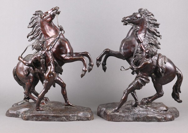 Lot 565 After Guillaume Coustou (1677-1746), a 19th century pair of patinated bronze "Marly" horses with attendant figures in loincloths (one with quiver), unsigned, each 50cm h x 40cm w £200-300