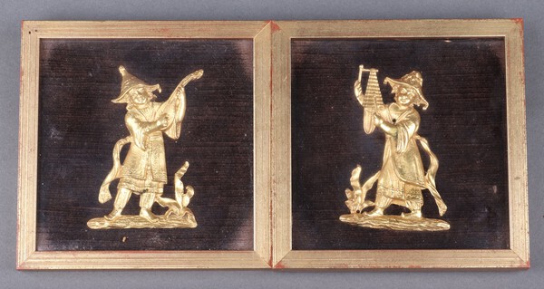 Two gilt metal furniture mounts in the form of standing musicians 9cm x 6cm