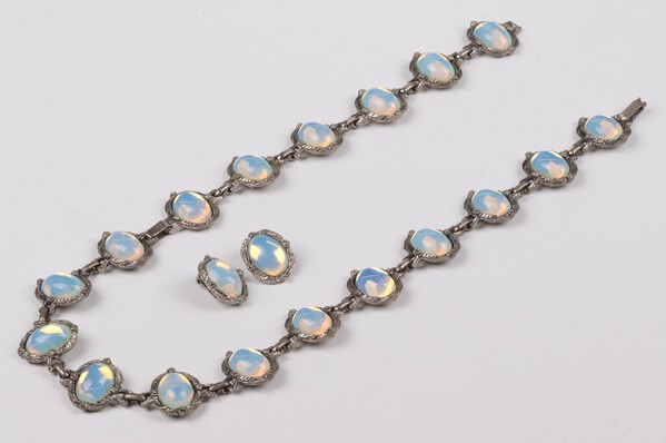 Lot 59 A faux moonstone necklet set cabochon cut stones 55cm, together with a pair of similar ear clips £80-100