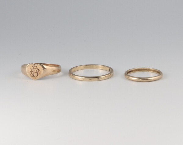 Lot 61 Two 9ct gold wedding bands and a gold signet ring marked 9ct, sizes R 1/2, J 1/2 and N 1/2, 5.4 grams £150-180
