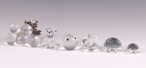 A Swarovski figure of a blow fish 5cm, boxed, ditto bear 5cm in an associated box, 2 ditto tortoises 4cm and 3cm, glass grape ornaments 7cm (1 grape f), together with a faceted glass model of a clam 4cm