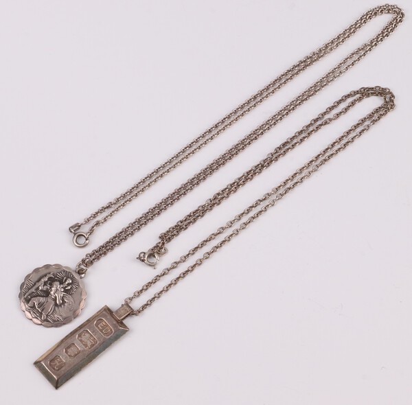 Lot 62 A silver ingot pendant hung on a fine silver chain, a silver St Christopher hung on a silver belcher link chain 31 grams £30-40