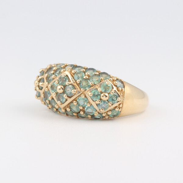 A 9ct yellow gold ring set 3 topaz, size M 1/2, 2.6 grams