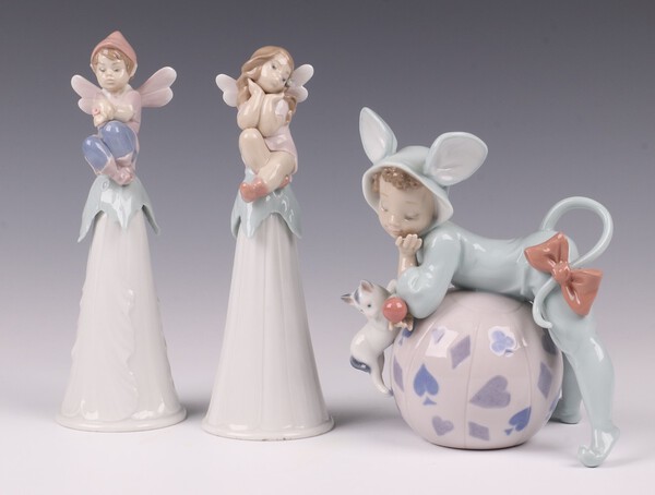 A Lladro figure - Mischievous Mouse no.5881 14cm together with 2 1996 Lladro table bells in the form of seated pixies on flower heads 16cm