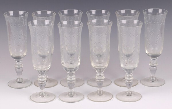 A set of 10 etched glass champagne flutes