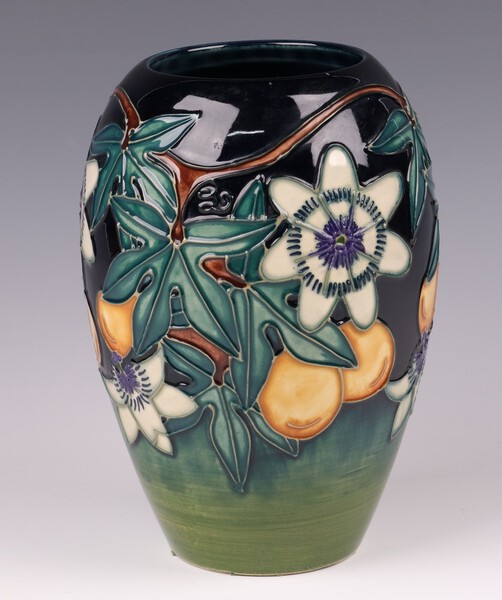 Lot 632 A Moorcroft green ground Passion Fruit vase, designed by Rachel Bishop, circa 1997, 19cm h boxed £60-80