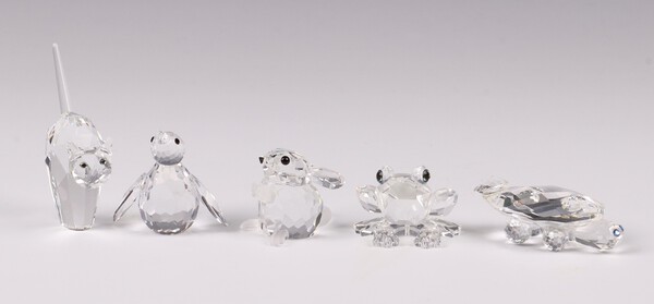 Five Swarovski Crystal figures - tortoise, cat, penguin, frog and mouse, all boxed