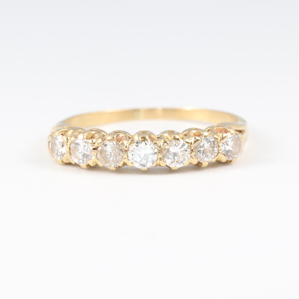 A gold testing as 22ct 7 stone diamond set ring, size N 1/2, 2.1g