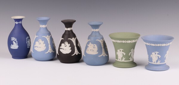 A pair of Wedgwood blue Jasper ware club shaped vases 12cm, impressed 64 and 76, a black Jasper ware club shaped vase RF 12cm, a green Jasper ware trumpet shaped vase 64 8cm and a blue ditto
