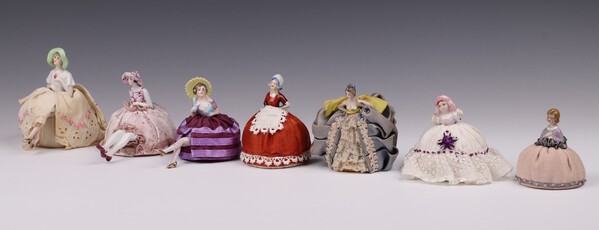 Seven 1930's pin cushion dolls with porcelain heads and legs 9cm