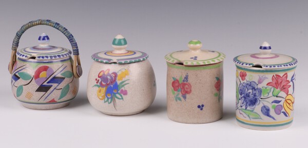 Carter Stabler Adams Ltd Poole, a preserve jar and cover 10cm (crackling to interior), 1 other with floral decoration 8cm and 2 Poole preserve jars and covers (1 with crack) 10cm h