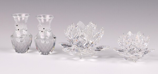 A Swarovski Crystal candle holder in the form of a flower head 5cm (1 petal missing), ditto 4cm and 2 club shaped vases decorated flower heads 7cm