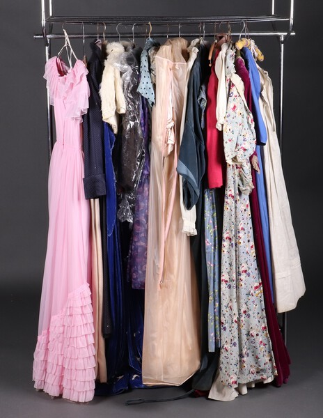 A collection of Vintage clothing including a Chresta Couture dress, a Harrods spotted dress, a Travers Tempos dress, a blue nurses uniform dress with British Red Cross badge, a cream wedding dress/ball gown, a Chresta jacket and one other and five other assorted dresses, sizes 10-14