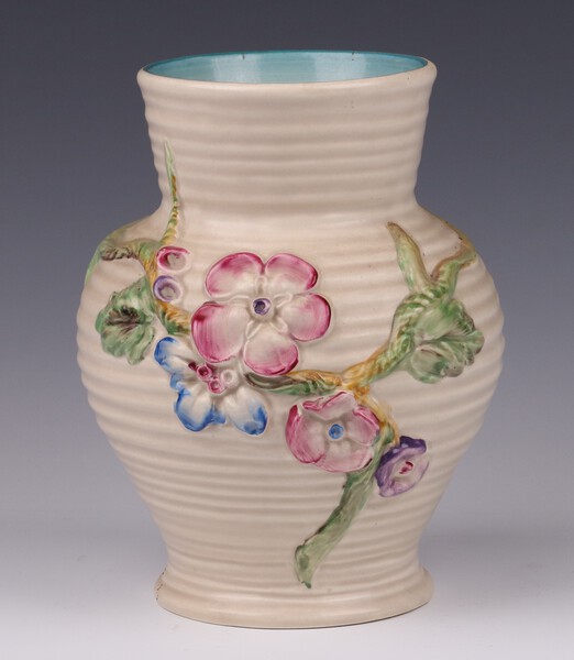 A Clarice Cliff Newport Pottery ribbed and floral patterned vase, base marked 912 17cm