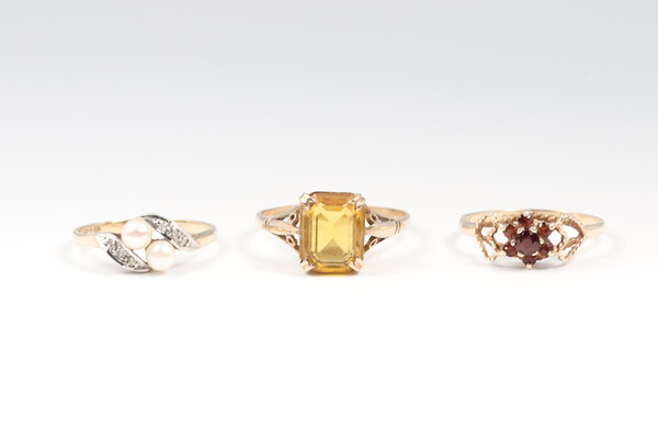 Lot 66 A 9ct gold pearl and paste set ring size K, 1.3 grams, a 9ct gold and garnet set ring size M 1/2, 1.2 grams and a gold ring marked 9ct citrine set ring size Q 1/2, 2 grams £80-120