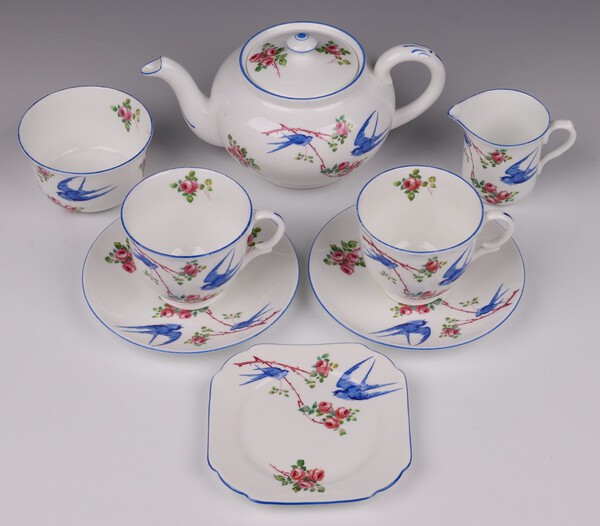 Lot 667 A Shelley 8 piece Bluebird pattern tea service with teapot, sugar bowl (blemish to the interior), cream jug, 2 cups (1 cracked), 2 saucers and a plate (cracked) £50-75