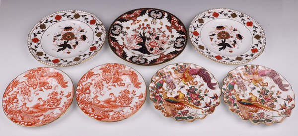 A Royal Crown Derby Imari pattern plate 383 LX 27cm, a pair of Royal Crown Derby Imari pattern plates XXXII 26cm and pair of a Royal Crown Derby Aves pattern plates A74 XXXVII 21cm and ditto pair of Olde Anniversary plates A37 XXXIVIII 21cm