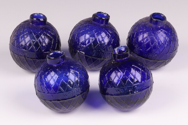Lot 674 Five Victorian Northern British Glassworks, Perth, moulded glass shooting target balls 'glass pigeons' in cobalt blue, each 7cm diam. £300-500