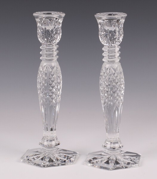 A pair of Waterford Crystal Bethany pattern candlesticks 25cm, boxed