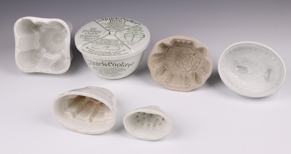 A Grimwade "The Quick Cooker" bowl 10cm and 5 jelly moulds (1 cracked)