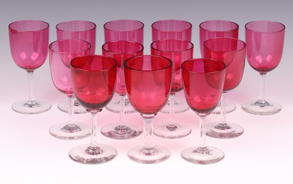 Thirteen 19th Century cranberry glass wine glasses with clear glass stems