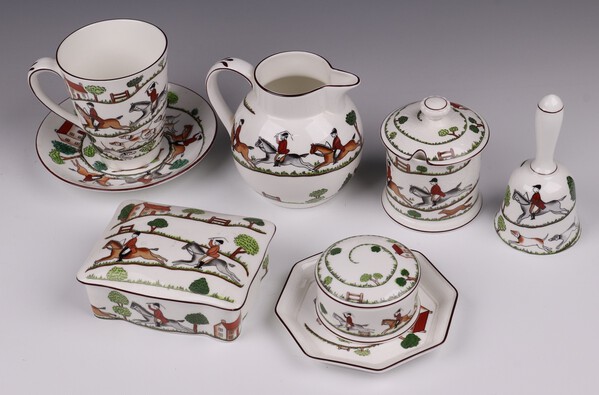 Six items of Royal Crown Derby Staffordshire hunting scene patterned china, comprising rectangular trinket box and cover 13cm, preserve jar and cover 7cm, hand bell 13cm, jug 11cm, cup, mug and saucer, together with a Coalport jar and cover 7cm and a Wedgwood octagonal dish 12cm