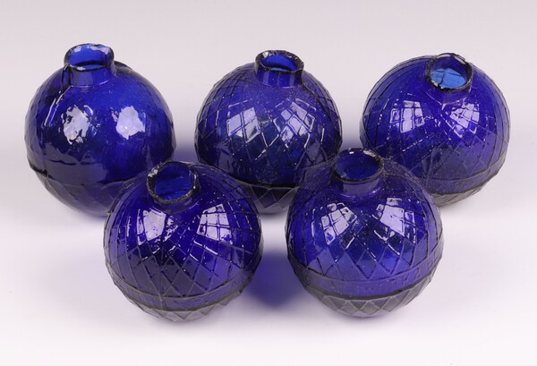 Lot 679 Five Victorian Northern British Glassworks, Perth, moulded glass shooting target balls 'glass pigeons' in cobalt blue, each 7cm diam. £300-500