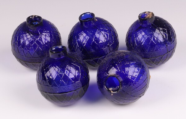 Lot 682 Five Victorian Northern British Glassworks, Perth, moulded glass shooting target balls 'glass pigeons' in cobalt blue, each 7cm diam. £300-500