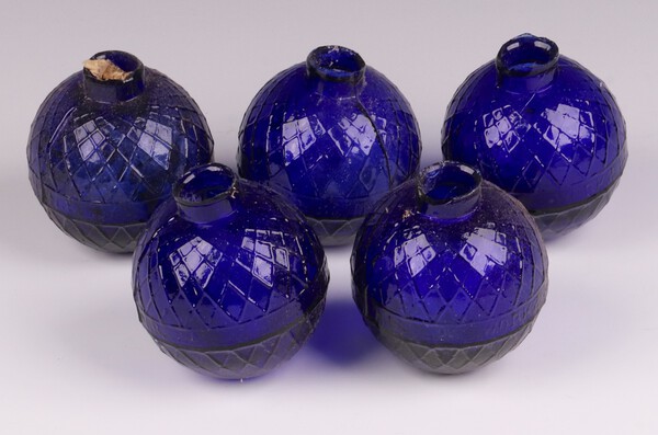 Lot 686 Five Victorian Northern British Glassworks, Perth, moulded glass shooting target balls 'glass pigeons' in cobalt blue, each 7cm diam. £300-500