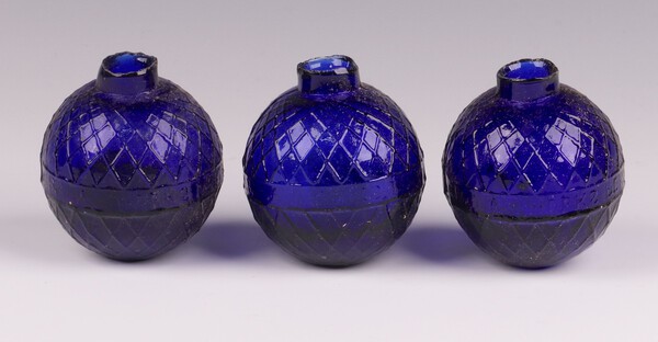 Three Victorian Northern British Glassworks, Perth, moulded glass shooting target balls 'glass pigeons' in cobalt blue, each 7cm diam.