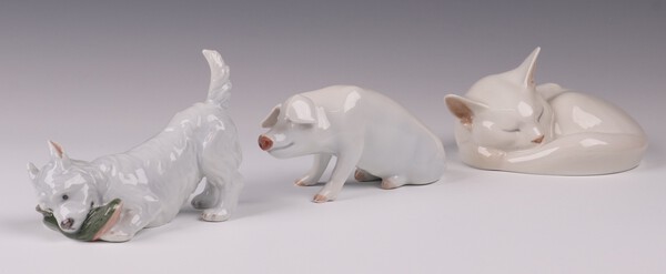 Lot 688 Three Royal Copenhagen figures - sleeping kitten base impressed 422 12cm, terrier with slipper 145 9cm, seated pig 101 13cm £40-50