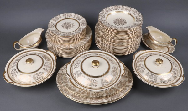 A 58 piece Johnson Brothers Victorian pattern dinner service comprising 3 tureens and covers (1 base cracked, 1 cover broken and stuck), 2 large oval meat plates, 2 small meat plates, sauce tureen (chipped) and stand, 12 large soup bowls (1 chipped), 12 small soup bowls, 11 dinner plates (1 chipped), 11 side plates (1 chipped)