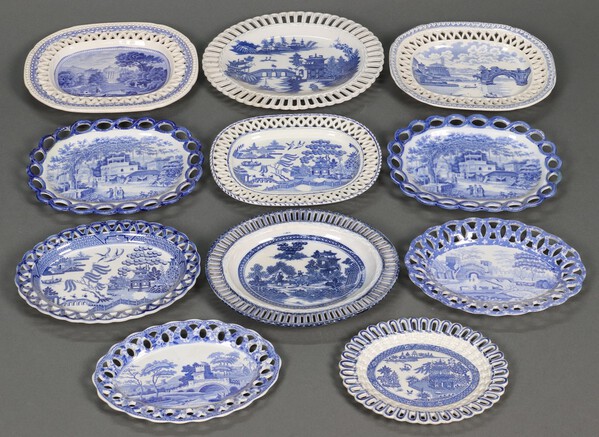 Lot 694 Two Spode blue and white transfer decorated ribbon ware dishes 24cm (1 cracked), a Riley's semi-china oval ribbon ware dish and 8 others £40-60