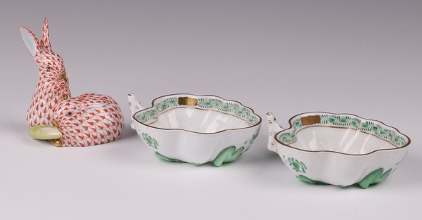 Herend, a porcelain figure of 2 rabbits 8.5cm and 2 leaf shaped cups 10cm