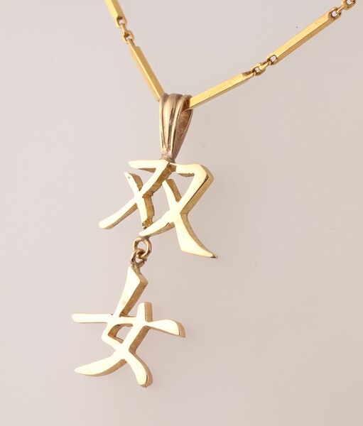 A gold testing as 18ct chain 38cm hung a Chinese script pendant 7.9g