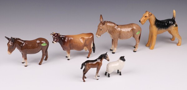 Lot 709 Six Beswick figures - Jersey cow no.1345 11cm, Airedale Terrier no.962 13cm, 2 donkeys 14cm and 12cm, a shire foal 8cm and a sheep 5cm £40-60