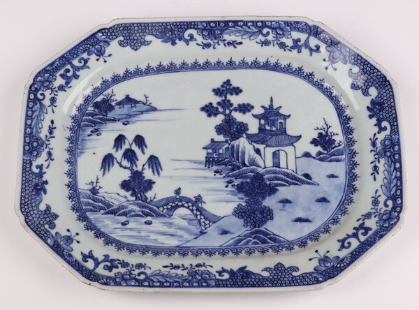 Lot 709 A Nanking octagonal blue and white meat plate decorated figures on a bridge by a pagoda 35cm £50-75