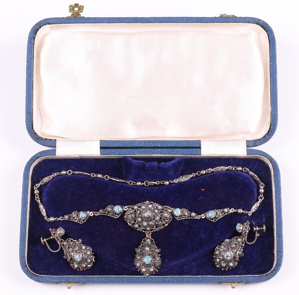 Lot 71 A suite of marcasite set jewellery comprising necklace and 2 earrings set hardstones, cased £40-50