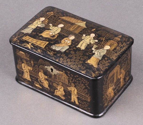 Lot 726 A 19th Century chinoiserie black lacquered trinket box with hinged lid decorated figures 8cm x 15cm x 10cm £40-60