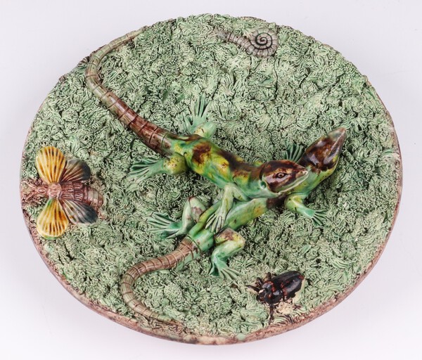 A Majolica pottery plate decorated 2 lizards, the base marked Glada 21cm