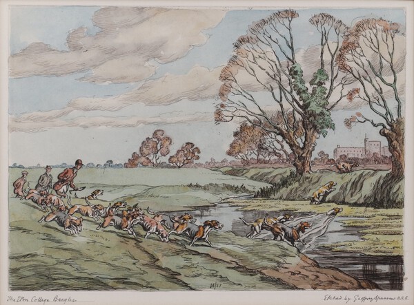 Lot 755 Geoffrey Sparrow (British, 1887-1969), "The Eton College Beagles", etching with hand-colouring, signed and titled in pencil, 22cm x 29cm, within a Hogarth style frame. £120-150