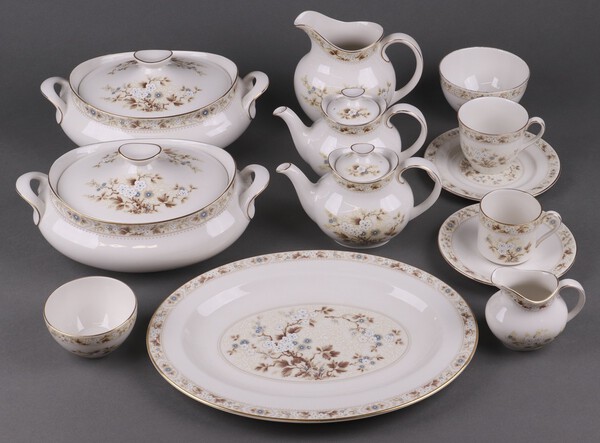 Lot 759 A Royal Doulton Mandalay pattern 93 piece dinner/tea service comprising 2 oval twin handled tureens and covers, oval meat plate, 9 dinner plates, 2 large side plates, 15 side plates, 9 tea plates, 13 dessert bowls (7 seconds), small bowl, large jug, 2 pairs of jugs, 2 teapots, twin handled plate, 10 tea cups (1 cracked), 9 saucers, 4 coffee cans, 4 saucers, large sugar bowl, 3 small sugar bowls, sauce boat stand (second) £50-75