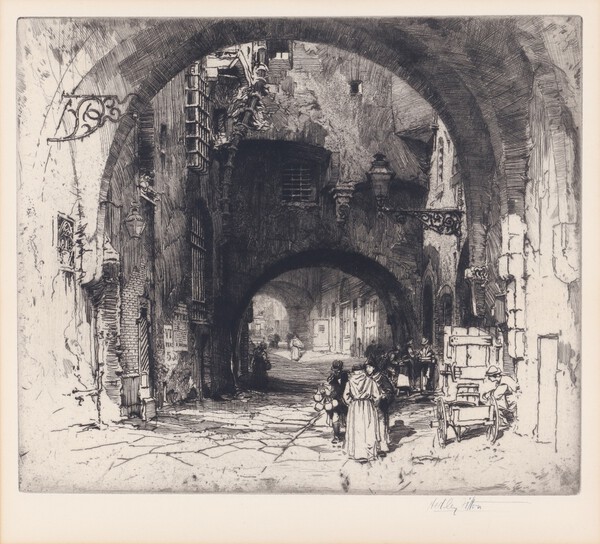 Lot 759 Hedley Fitton (British, 1857-1929), "Via dei Girolami, Florence", 19th century etching, signed in pencil recto, title verso, 32cm x 35cm, within a stained wood frame. £40-60