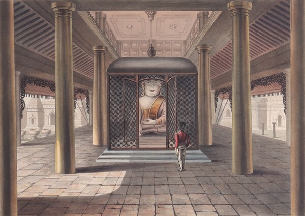 George Hunt, after Joseph Moore, "Inside View of the Gold Temple on the Terrace of the Great Dagon Pagoda at Rangoon", aquatint with hand colouring, published 1815, from Moore's "Eighteen Views taken at and near Rangoon", 26cm x 36cm, within a gilt frame.