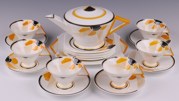 Lot 765 A Shelley, Art Deco Sunray pattern 23 piece tea service, bases marked 114Y2E, comprising teapot, sugar bowl (base a/f), cream jug (base a/f), twin handled bread plate, 6 tea plates (4 cracked), 6 cups (2 cracked), 6 saucers £200-300