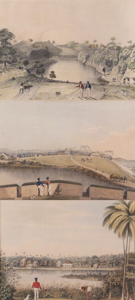 John Deschamps, "The Galle-face Esplenade, from Middleburg Counterguard", "Colpitty, from the Cinnamon Gardens", "The Lake of Kandy", three stone lithographs with hand-colouring, published for "Scenery and Reminiscences of Ceylon" by Ackermann & Co 1845, each 22cm x 32cm, all within matching painted wood and gilt frames. Note: "Scenery and Reminiscences of Ceylon" was an important and ambitious survey of mid-19th century Sri Lanka, where Deschamps spent nine years as an officer in the Royal Artillery