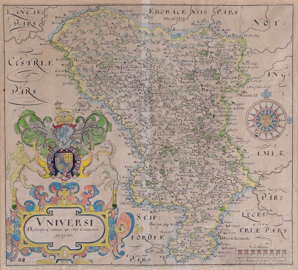 Lot 770 William Hole, after William Saxton, "Universi Derbiensis Comitatus qui olim Coritanorum Suit descripto" (Map of Derbyshire), 17th century engraving with hand-colouring, 30m x 33cm, within a gilt frame. £50-80